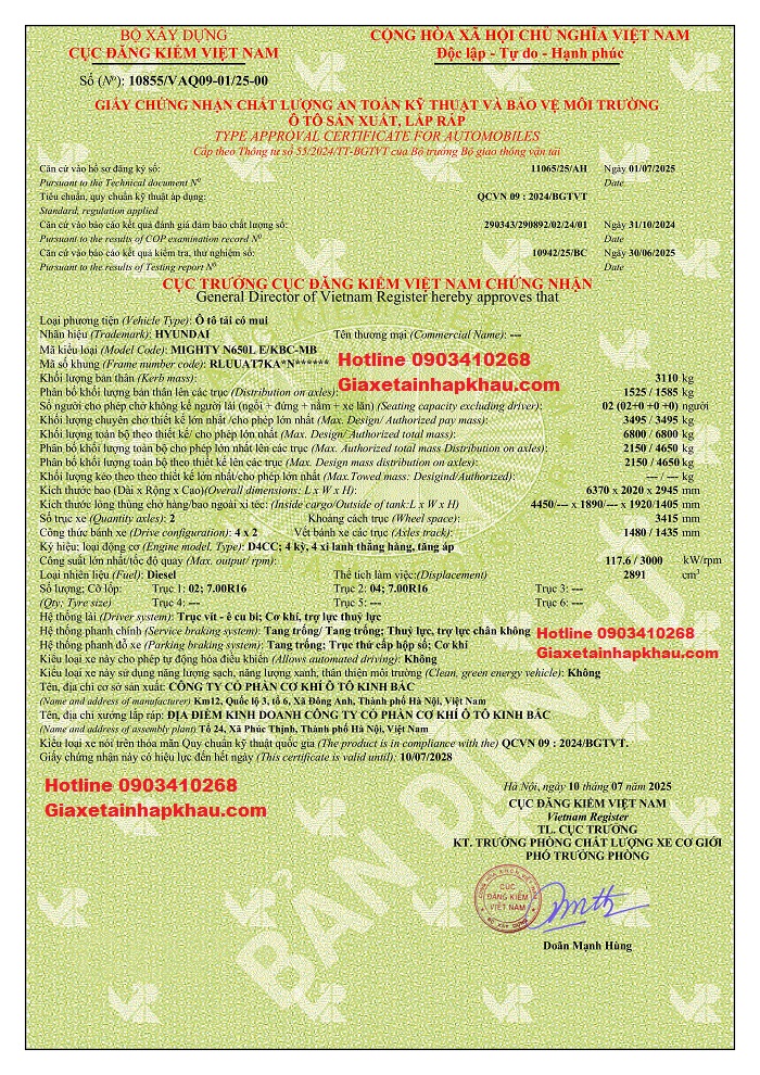 Mẫu thùng bạt Hyundai Mighty N650LE E5 của Công ty CP Cơ Khí Ô Tô Kinh Bắc, tải trọng dự kiến 3,49T, Lòng thùng khoảng 4.500 x 1.900 x 1.920 mm