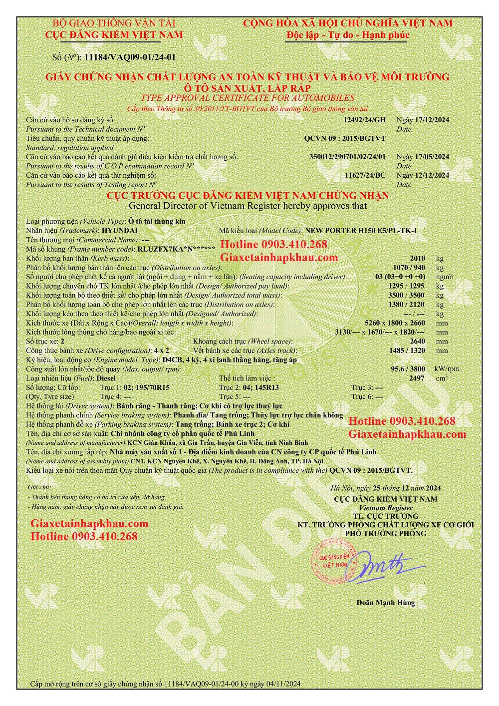 Giấy chứng nhận An Toàn Kỹ Thuật và Bảo Vệ Môi Trường Mẫu thùng kín Composite H150 E5 Phú Linh mới nhất 2024: