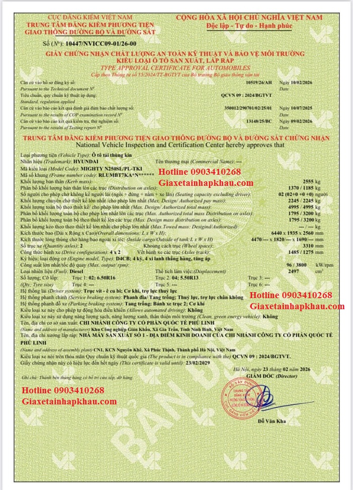 Mẫu giấy chứng nhận an toàn kỹ thuật và bảo vệ môi trường xe Hyundai Mighty N250SL E5 Thùng Kín Phú Linh mới nhất 2026: