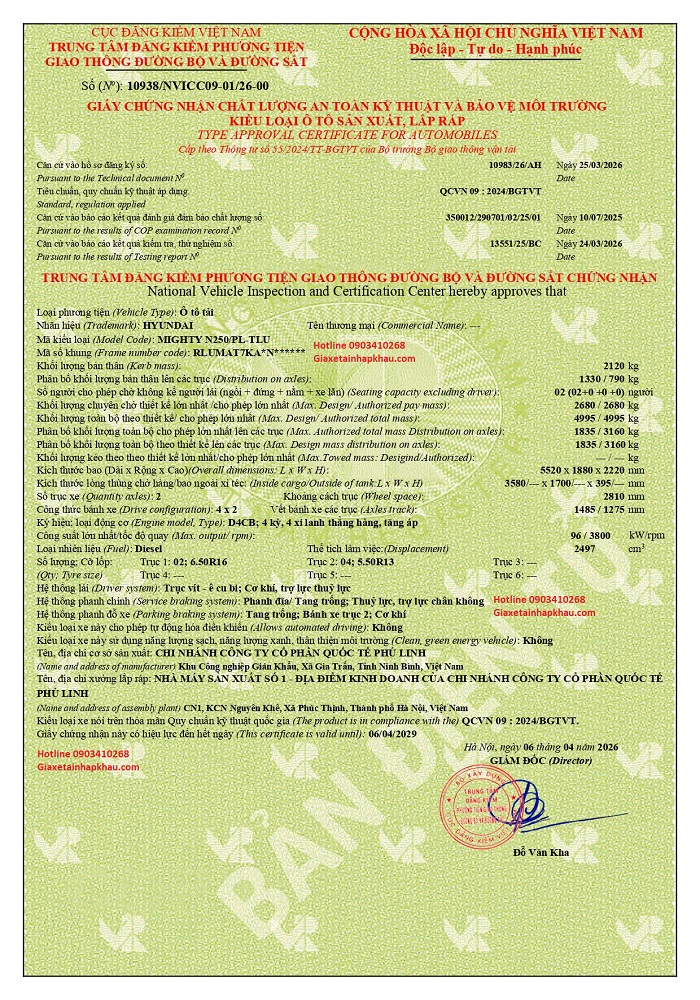 Mẫu giấy chứng nhận an toàn kỹ thuật và bảo vệ môi trường xe Hyundai Mighty N250 E5 Thùng Lửng Phú Linh mới nhất 2026: