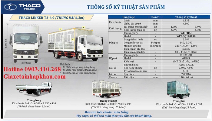 Nhằm đa dạng hóa sản phẩm và phục vụ quý khách hàng có nhu cầu vận tải hàng hóa cần kích thước thùng lớn và tải trọng xe dưới 2t (Có thể xin giấy phép phố cấm), nhà máy Thaco đã ra mắt dòng xe tải mới Thaco Linker T2-6.9 với 2 cấu hính tải trọng 1,7t và 3,49t thùng dài 6,3m,...