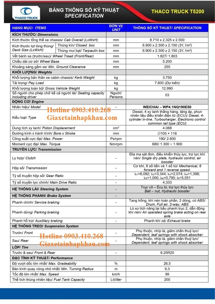- THACO TRUCK T5200 – Tải trọng 7.600 KG (Dự kiến) – Kích thước thùng lọt lòng (DxRxC): 6.900 x 2.300 x 2.150 (mm) – Giá chassis: 699.000.000 VNĐ