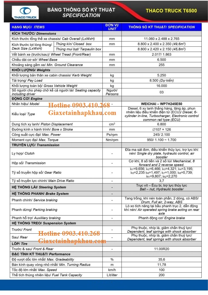 - THACO TRUCK T6500 – Tải trọng 8.500 KG (Dự kiến) – Kích thước thùng lọt lòng (DxRxC): 8.800 x 2.400 x 2.350 (mm) – Giá chassis: 929.000.000 VNĐ