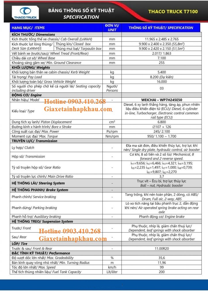 - THACO TRUCK T7100 – Tải trọng 8.200 KG (Dự kiến) – Kích thước thùng lọt lòng (DxRxC): 9.900 x 2.400 x 2.350 (mm) – Giá chassis: 959.000.000 VNĐ