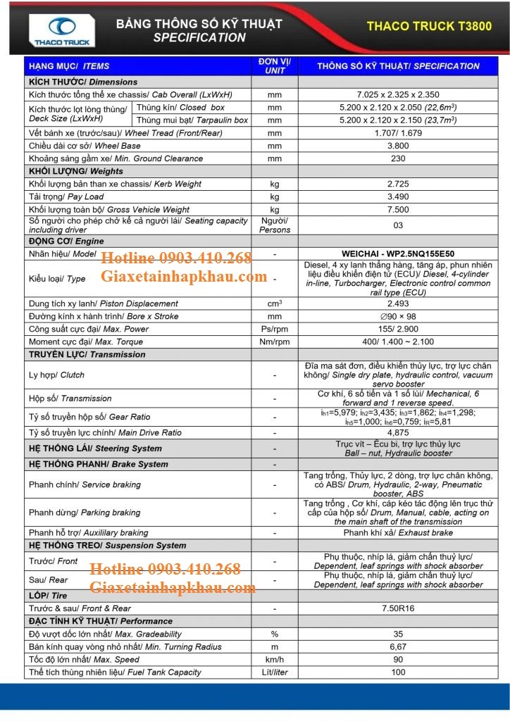 - THACO TRUCK T3800 – Tải trọng 3.490 KG – Kích thước thùng lọt lòng (DxRxC): 5.200 x 2.120 x 2.050 (mm) – Giá chassis: 529.000.000 VNĐ