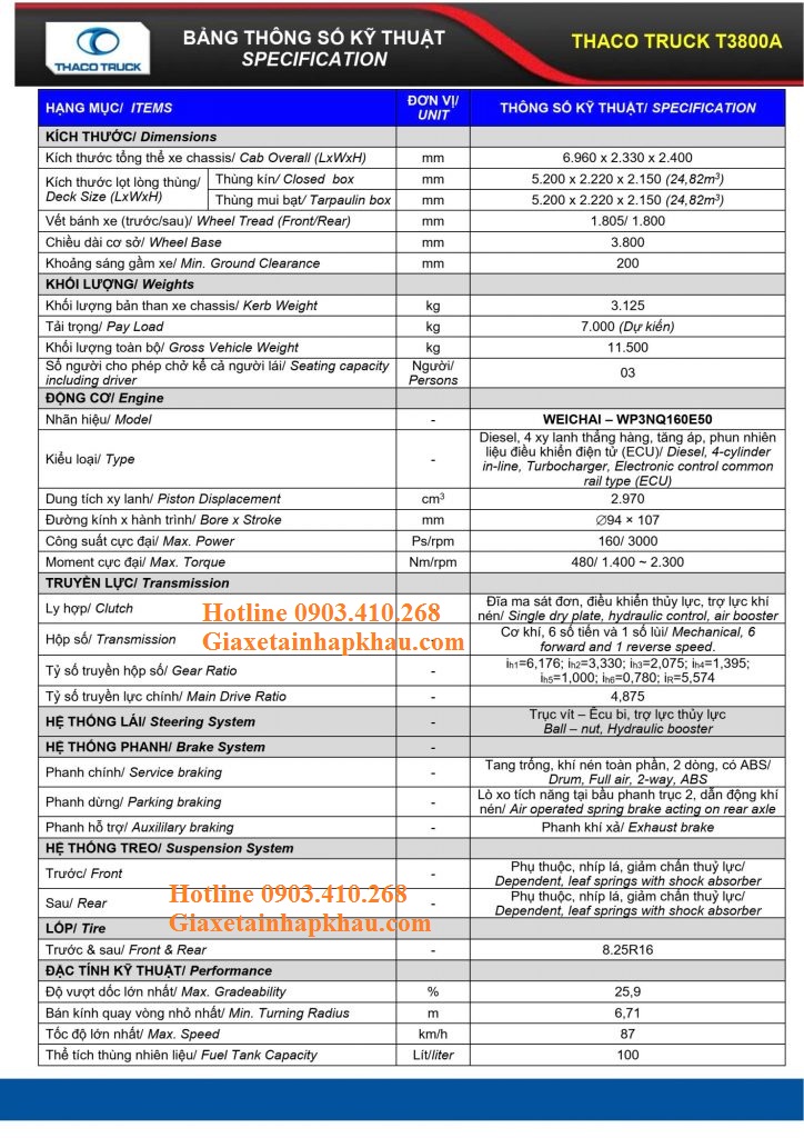 - THACO TRUCK T3800A – Tải trọng 7.000 KG (Dự kiến) – Kích thước thùng lọt lòng (DxRxC): 5.200 x 2.220 x 2.150 (mm) – Giá chassis: 559.000.000 VNĐ