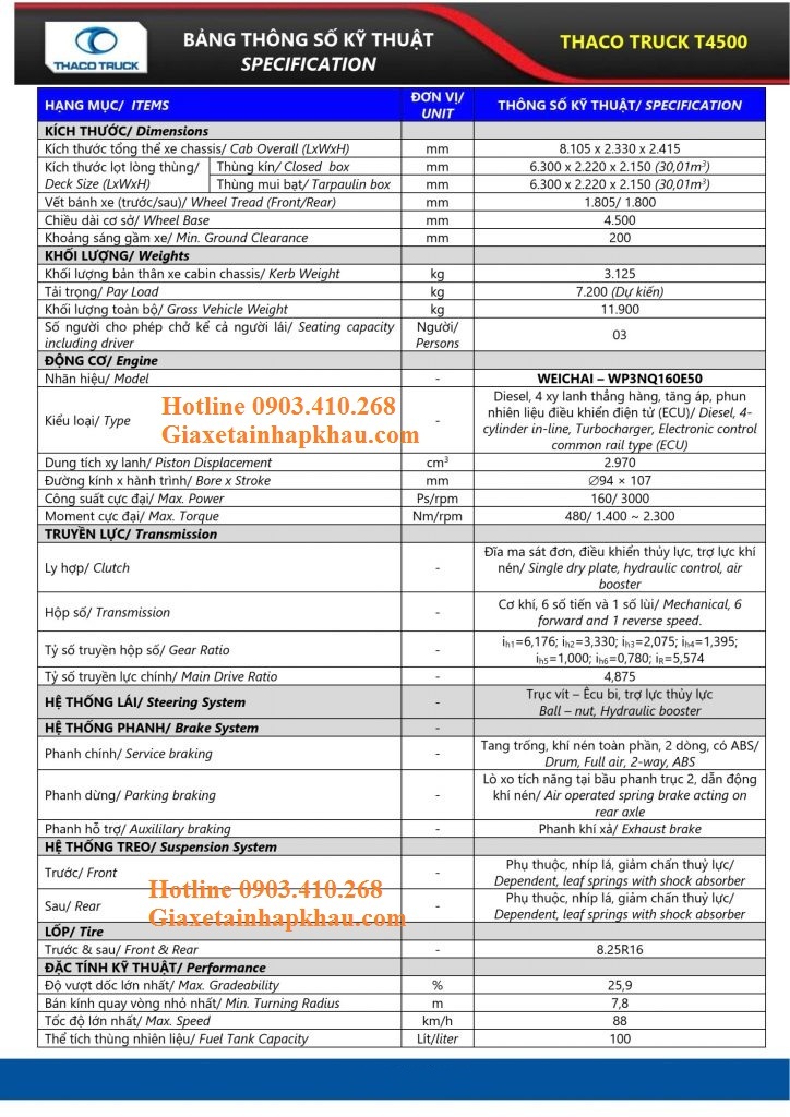 - THACO TRUCK T4500 – Tải trọng 7.200 KG (Dự kiến) – Kích thước thùng lọt lòng (DxRxC): 6.300 x 2.220 x 2.150 (mm) – Giá chassis: 604.000.000 VNĐ