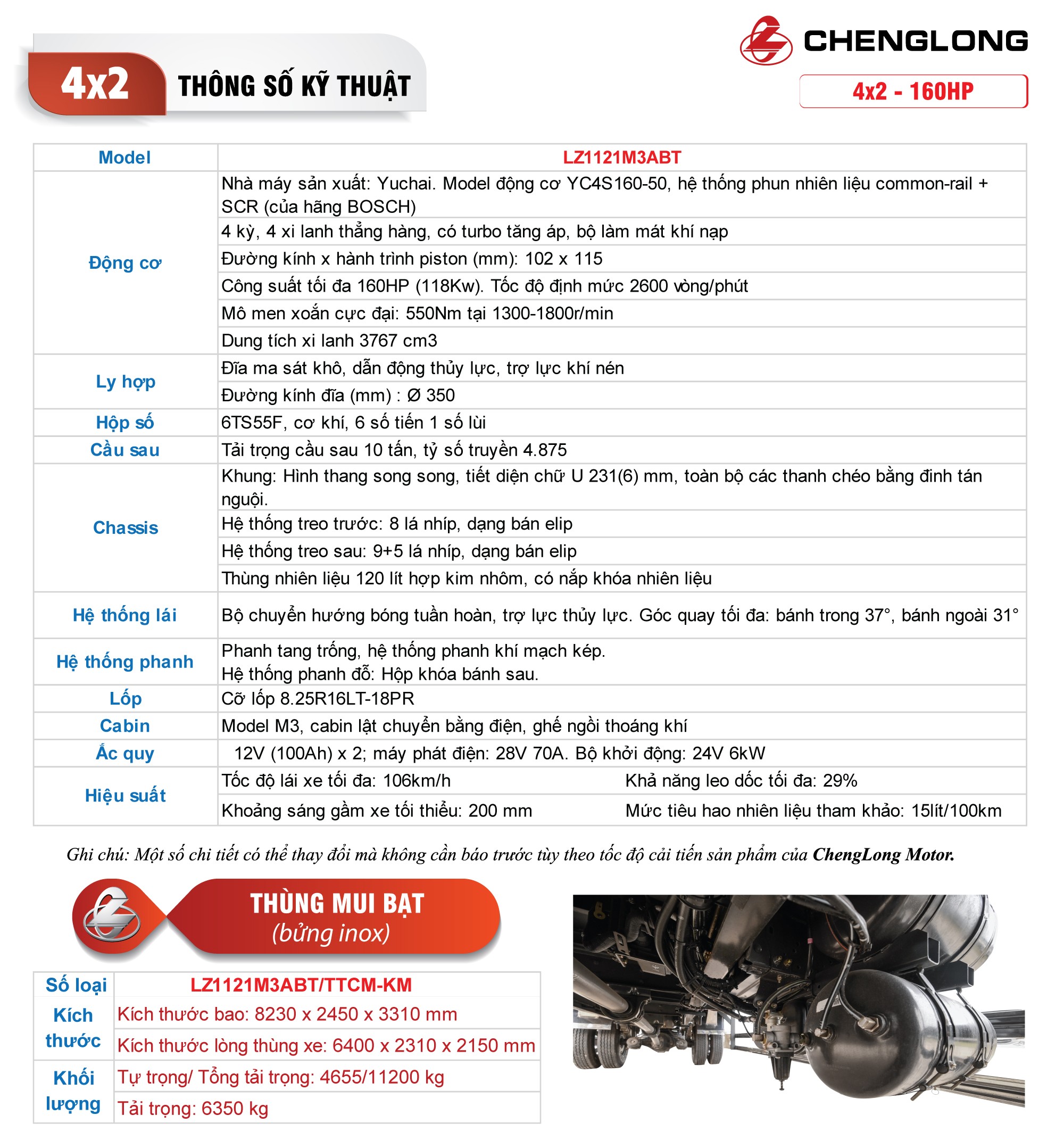 Vì vậy, với các thông số kỹ thuật trên, xe tải Chenglong M3 160HP có thể vận hành tốt trên đa dạng địa hình và môi trường khác nhau, đồng thời đáp ứng được nhu cầu chuyên đồ hóa của người sử dụng.